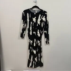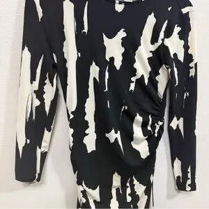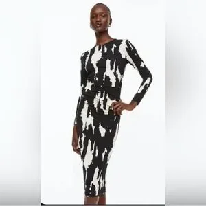 H&M Black White Abstract Print Ruched Midi Dress Long Sleeve Small