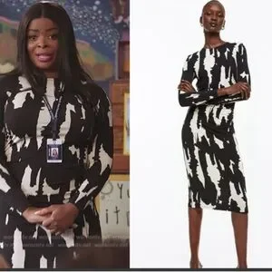 hm, h&m dress, abstract print, black white dress, workwear, office chic, midi dress, ruched dress, bodycon, minimalist, classy, teacher outfit