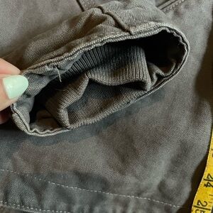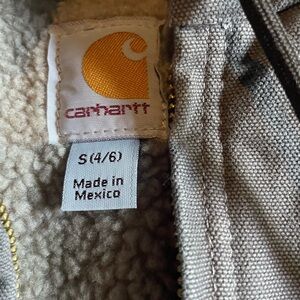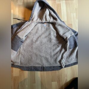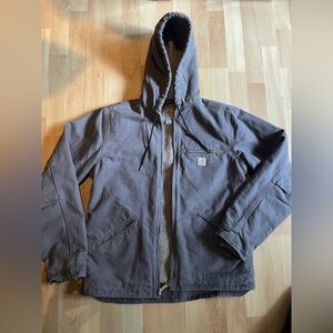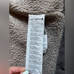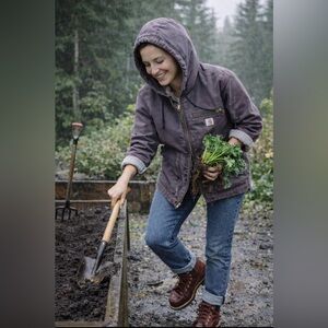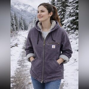 Heavy-duty women’s Carharrt hooded work jacket with zip front. Sherpa lined for incredible warmth. Reinforced chest pocket and roomy hand pockets. Rugged stitching and durable fabric for outdoor tasks. Similar to the women’s defender jacket, but this one is shirt aligned, and has the fitted stretchy cuffs inside for a warm seal. Heavy duties zipper as expected from Carhartt incredible quality. Never worn in brand new condition. Just a little too big for me. Fits more of a 6/8. and I reach for my storm defender way more. This is in a light gray purple color, closest to the AI model photos.