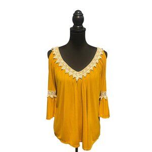 Bohemian Cold Shoulder Top is a stylish and versatile piece Featuring Crochet accents Trim on The V- Neckline and 3/4 Bell Sleeves. Tie on upper back. Can be easily paired with your favorite Jeans for a chic and effortless outfit. This is the perfect addition to your wardrobe.