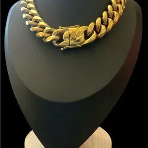 Bold chunky cuban link necklace. 18K gold plated over stainless. Secure box clasp with safety latch. Statement piece for evening or everyday wear. Necklace is 24” and is 18mm. Very heavy.