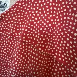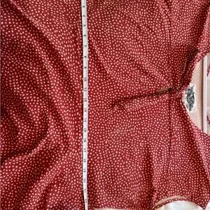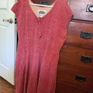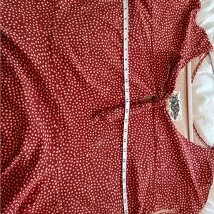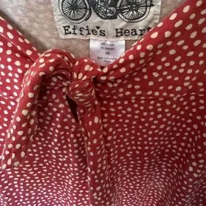 Effie's Heart midi dress in a dark orange with small white polka dots. V-neck with a front tie detail. Flowy A-line skirt and short sleeves. Lightweight fabric for easy wear. Cute, vintage-inspired print. Comfortable and Pockets!!!