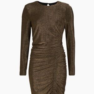 Shimmer in style with this elegant metallic dress. Featuring a stunning gold hue, this dress is perfect for any special occasion. The long sleeves add a touch of sophistication. *Dress has some pulling*