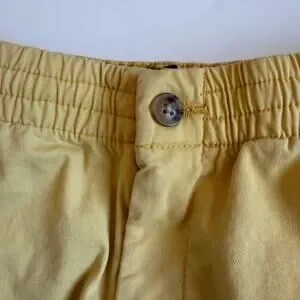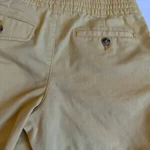 Size 10 Boys, Polo Ralph Lauren, Prepster Flex Abrasion Twill Shorts in yellow. Navy blue signature Polo pony embroidered on left leg. Elastic waistband with adjustable drawstring. 98% cotton 2% spandex. No stains or flaws. Play condition for several light stains. See close up photos.