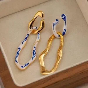 Asymmetrical white & blue enamel gold dangle earring; nwot