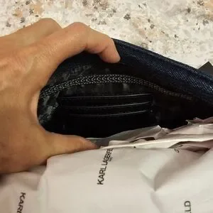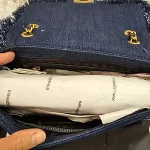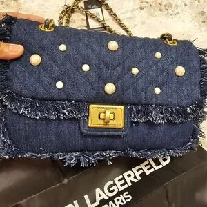 Karl Lagerfeld shoulder bag in quilted navy denim. Decorative pearl studs on front. Frayed trim for a casual look. Gold-tone chain strap and turn-lock closure. Stylish and versatile for day or night.