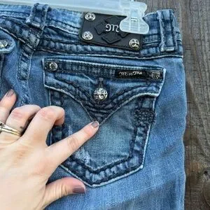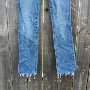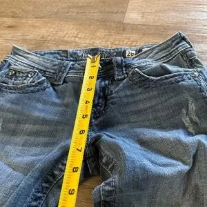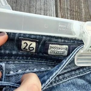 Miss Me Jeans Women's size 26 Distressed Denim Straight Low Rise Frayed Hem. Pre owned condition missing button on back pocket selling as is