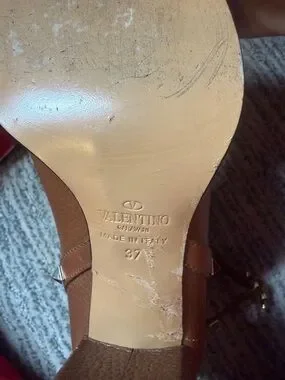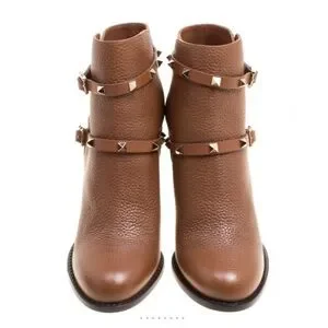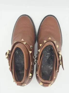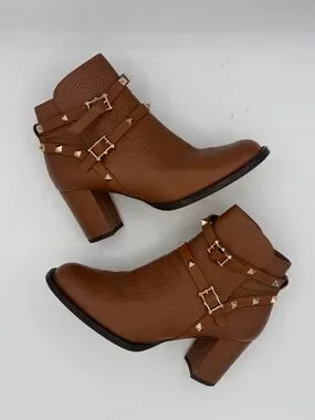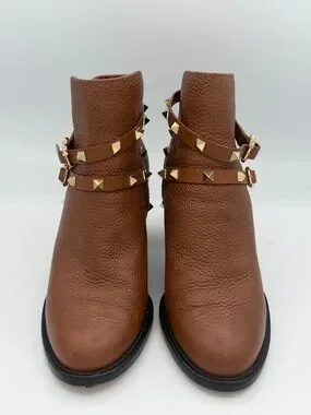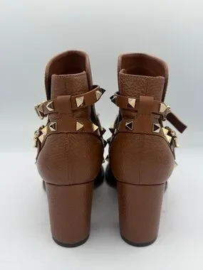 Valentino Brown Leather Rockstud Block Heel Ankle Boots Size 7/ EU 37