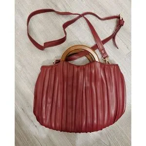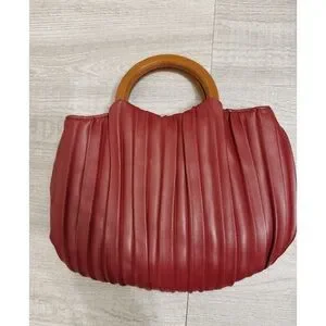 A super cute mini bag with fun wooden handles and a chic pleated design. In like new condition, some minor scratches on the wooden handles but otherwise like new. Measurements as pictured, strap is adjustable. Open to offers!