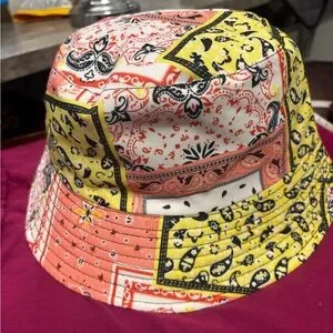 This vibrant bucket hat features a playful bandana print, perfect for adding a pop of color to any outfit. Ideal for sunny days, it combines style and comfort.