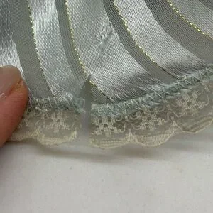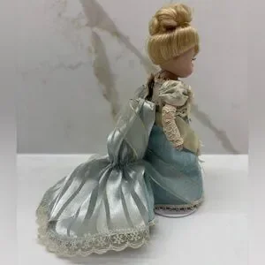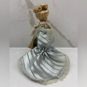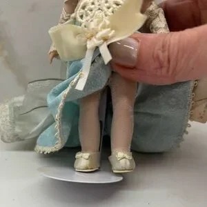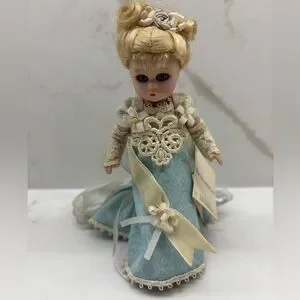 Overall good condition with some yellowing on costume. One cut in dress as shown in the back. Beautiful doll in a blue dress with cream lace. Elegant floral accents.