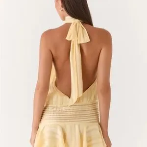 Chic backless design with halter neck. Soft yellow fabric. Perfect for summer outings.