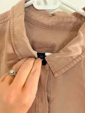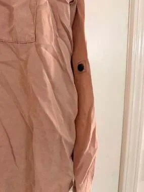 Universal Thread Women's Utility Shirt in a muted mauve/rose color. This relaxed fit button-down features dual chest pockets and versatile roll-tab sleeves for a customizable look. Crafted with a lightweight, breathable fabric that is perfect for layering or wearing on its own. Pair it with jeans or chinos for a casual, effortless style.\n\nIncludes original dark hardware. Excellent pre-owned condition with no stains, holes, or significant wear.