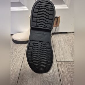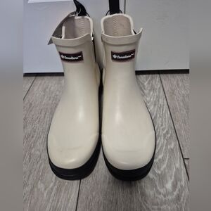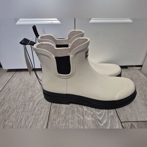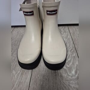 Short cream rain boots by Canadiana. Slip-on design with pull tabs. Contrasting black sole for grip. Simple, versatile look.