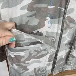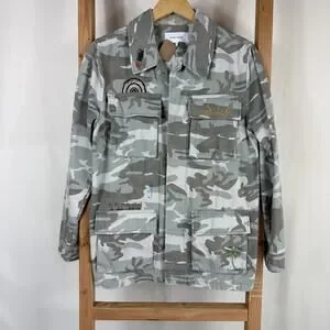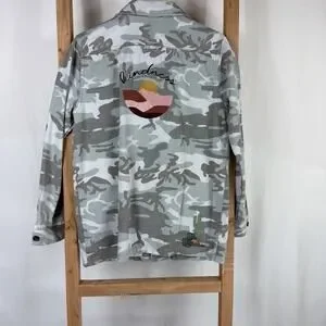 Description: Collared, button up, light washed camo, embroidery, pockets, extra button jacket. Cotton. Great Jacket. See photos of back where "kindness" is embroidered! Cute!!!