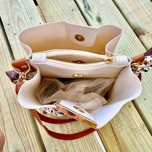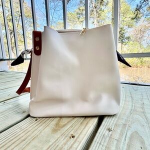 This elegant women's bag features a stylish white body with brown accents, perfect for any occasion. The chic design is complemented by a breaded strap detail, making it a standout accessory. PU Leather. Long strap is removable. Three (3) compartments. NWOT.