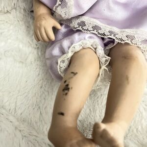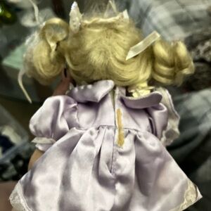 Charming porcelain doll in a lavender dress with lace trim. Soft blonde hair and detailed facial features for imaginative play. Lightweight and collectible design suitable for display or gentle play. Lavender color adds a sweet, classic look. Call outs in picture ! no cracks !