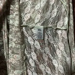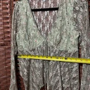 Sheer floral lace blouse in sage green with subtle pink accents. V-neck with a tie-front closure. Long sleeves and feminine silhouette. Lightweight layering piece for casual or dressy looks.