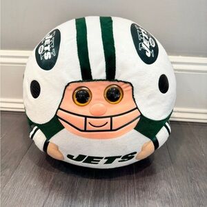 Adorable NFL Jets plush toy. Features team colors and logo. Soft and cuddly design.