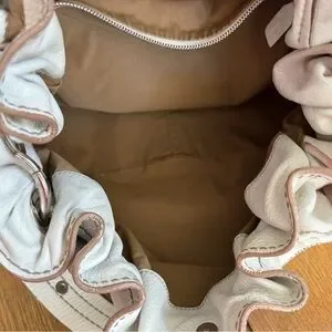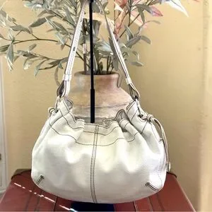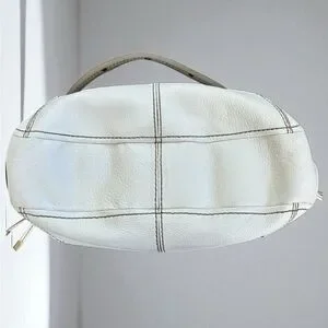 Supple white grained leather offset with polished silver metal hardware and a slight gathered top make this beautiful handbag. Just the right size to carry all your daily essentials!