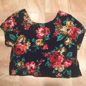 Women's Floral Pixelated Graphic Dark Navy Blue Short Sleeve Crop Top- Bow Back