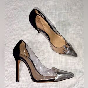 Sleek women's pointed-toe stiletto pumps with clear PVC side panels. Silver metallic toe and black suede heel counter create a modern, elegant look. Comfortable padded insole and high heel for a flattering silhouette. Versatile design perfect for evening and special occasions.Size 7 B Excellent condition