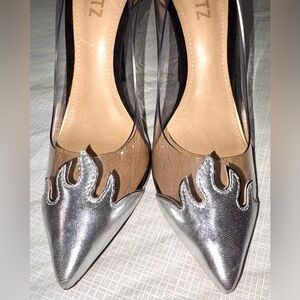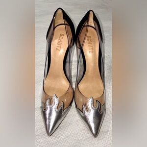 Schutz Den Flame Sz 7 Clear Panel Pointed-Toe Stiletto Pumps Silver Black suede