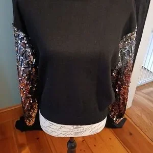 Black pullover sweater with shimmering sequin-gradient sleeves. Features silver and copper-tone sequins for a striking look. Comfortable knit body for casual or dressy wear.