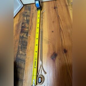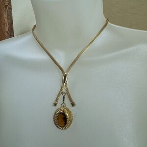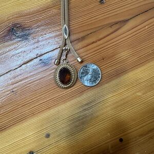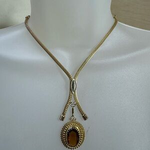 Classic Sarah Coventry lariat necklace in a warm gold finish. Features an amber-tone oval pendant with textured frame. Sleek sliding lariat styling for adjustable wear. Polished gold shine pairs with the deep amber hue. 11” inches good condition