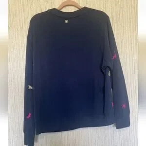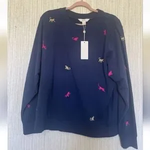 New with tags from the brand Lilly Pulitzer in a size medium. This is the ballad long sleeve sweatshirt in low tide navy monkey half drop. It has a solid navy blue background with embroidered monkeys throughout. The material does have stretch. I do not see any flaws with it. Please review all pictures and ask any questions you may have.