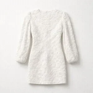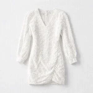 Keywords: Just Me dress, white lace mini, floral lace dress, 3D lace, ruched skirt, wrap front dress, V neck mini, long sleeve dress, back zip dress, romantic bridal, cocktail party dress, bachelorette outfit, engagement dress, graduation dress, size small dress