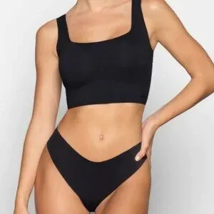 Features removable cups, wide, non-adjustable straps, tonal matte SKIMS Logo on front bottom left side.