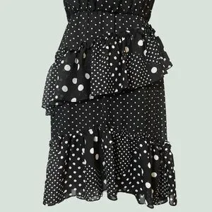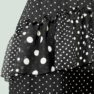 With a tiered ruffle skirt and clashing polka dots, this playful dress gives classic Betsey Johnson camp in a cocktail silhouette & understated colorway. A sheer shell and ruched, spiraling ruffles create an airy, lightweight drape that's made to be twirled, whether you're on a dance floor or simply going glam at a party.