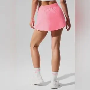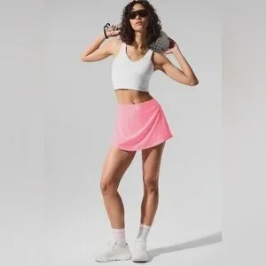 Alo activewear skort in bright neon pink. Soft stretch waistband with subtle logo. Lightweight, breathable fabric. Sporty and feminine look.