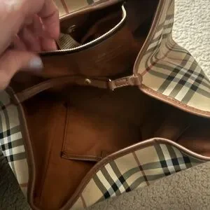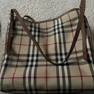 Elegant Burberry shoulder bag with iconic check pattern. Features tan and red hues. Stylish and versatile design. Carried for a few seasons- lots of life left. A few marking in the canvas - see pics.