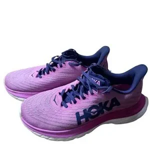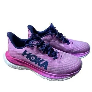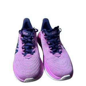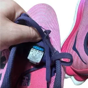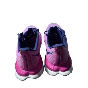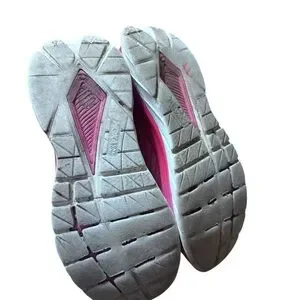 Cushioned running shoes with responsive midsole. Breathable knit upper for airflow. Secure fit with padded tongue and collar. Durable outsole for road traction. Bold pink color with navy branding and laces.