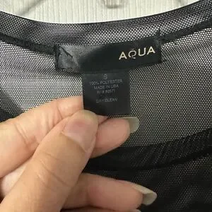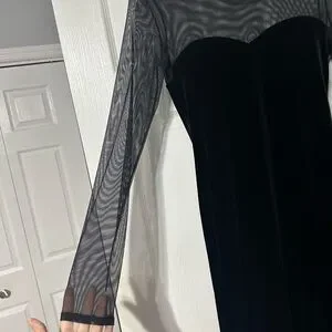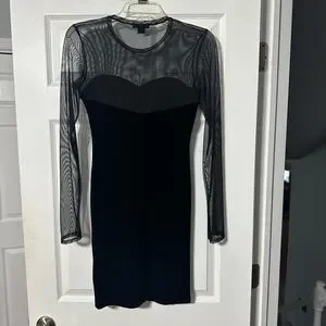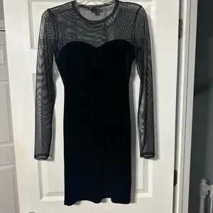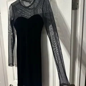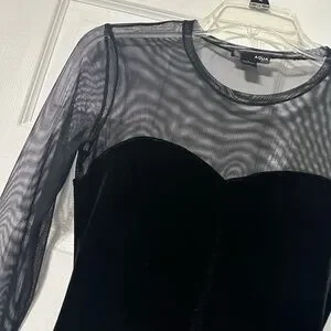 Chic Aqua black velvet dress. Features sheer long sleeves and a sweetheart neckline. Pullover style. 100% Polyester stretch material. Size small. Perfect for party or night out.