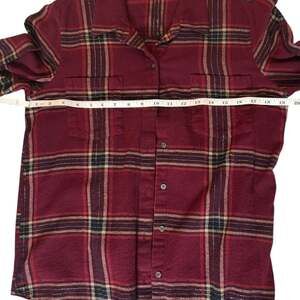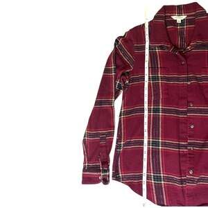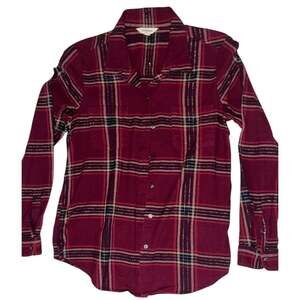 Lucky Brand Women's Plaid Flannel Shirt in a rich burgundy and red colorway. This long-sleeve top features a classic button-down front, two chest pockets, and a subtle metallic lurex thread woven throughout for a touch of shine. Made from a comfortable 99% cotton blend. Perfect for layering during the autumn and winter seasons. Excellent pre-owned condition with no significant wear, stains, or holes.
