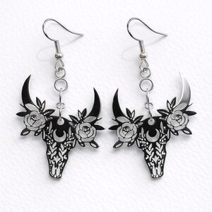 ✨ Bold western-style dangle earrings featuring intricate bull skull + floral detailing