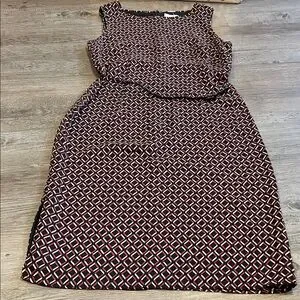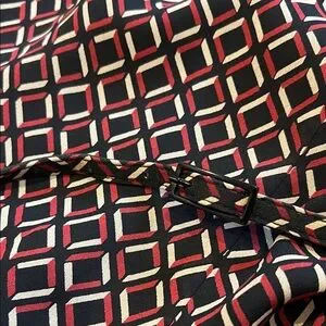 Chic dress with a bold geometric design. Features red and black hues. Fully lined dress.