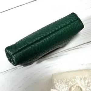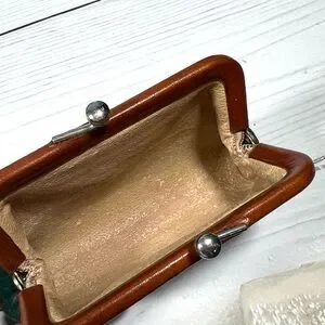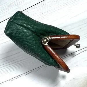 Compact forest green leather coin purse with tan leather trim and kiss-lock closure. Crafted for secure everyday carry and easy access. Classic silhouette complements casual and dress looks.