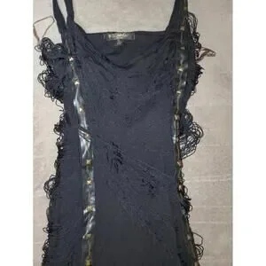 Black mini dress by rocawear featuring distressed fringe detailing along the sides and front. Sleeveless design with thin straps and decorative leather-like trim with stud accents. Perfect for casual or party wear. #rocawear #y2kfashion #vintage