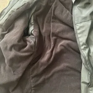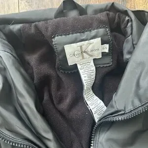 Sleek black raincoat by Calvin Klein Jeans. Water-resistant shell with full front zipper and fleece lining. Two large front flap pockets for storage. Stand collar for added coverage. Simple, versatile design for everyday wear.