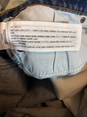 Casual cutoff denim shorts with a frayed hem. Classic five-pocket styling and belt loops. Mid to dark blue wash for versatile wear. Relaxed fit for easy everyday styling.