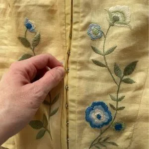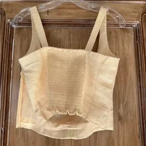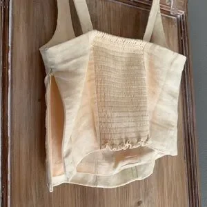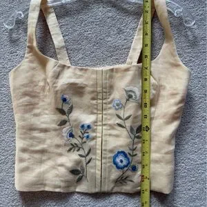 This linen tank in parmesan has never been worn and in perfect condition. It has adjustable straps and side zip. Beautiful floral embroidery and corset-like structure. Size 6. I live in a smoke-free/pet-free home.