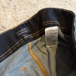 Banana Republic wide-leg denim pants in indigo. Contrasting gold topstitching details. Classic five-pocket styling. Clean, versatile look for many outfits.