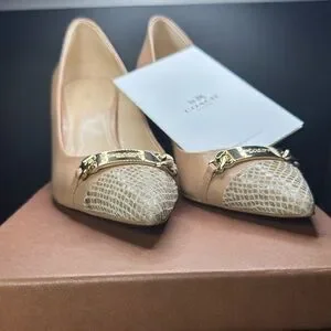 Coach Nude Pointed-Toe Flats with Gold Chain & Snakeskin Toe