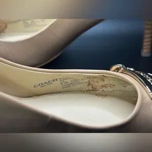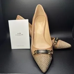 Coach women's pointed-toe flats in nude leather. Textured snakeskin-pattern toe. Gold chain hardware across the vamp. Sleek low-profile silhouette for everyday wear.