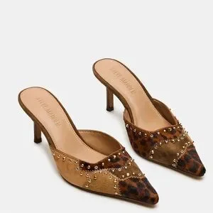 Pointed mule heels with leopard-print and tan panels. Gold-tone studs accent the upper. Slip-on silhouette for easy styling. Chic for both day and night outfits.