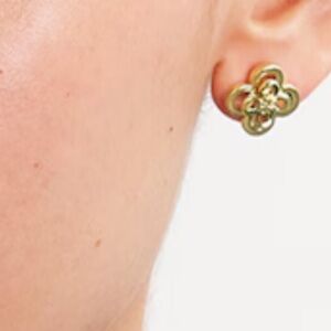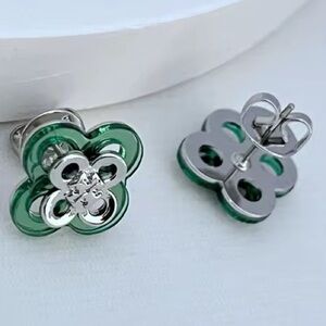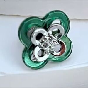 TORY BURCH STACKED GREEN + SILVER LOGO KIRA CLOVER STUD EARRINGS
